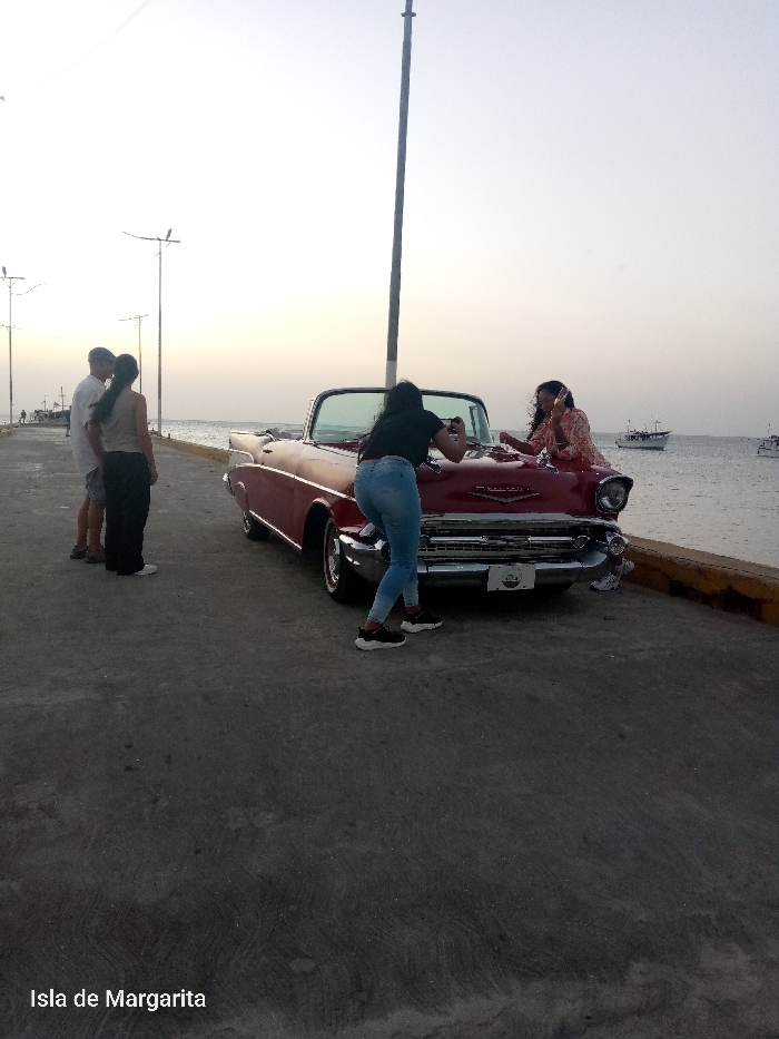 The scene depicts a waterfront area on Isla de Margarita, specifically in the city of Juan Griego, Venezuela, at dusk or dawn. Four individuals are present near a classic red convertible. In the foreground, a dark-colored paved surface extends across the image. A low, light-colored concrete barrier separates this surface from a body of water on the right. On the right side of the paved area, a vintage red convertible, consistent with a 1957 Chevrolet Bel Air, is parked with its top down. The vehicle features prominent chrome bumpers, grille, and trim. A woman (Subject 1), with dark hair, is leaning against the front hood of the car, facing slightly left, appearing to pose. She is wearing a light-colored, patterned long-sleeved top. Another woman (Subject 2), with dark hair, is positioned in front of the car, bending forward with a device (likely a smartphone) held to eye level, actively photographing Subject 1. Subject 2 is dressed in a black t-shirt, light blue jeans, and dark sneakers. Further to the left, a man (Subject 3) and another woman (Subject 4) are standing on the paved surface, facing towards the water or the car. Subject 3 is wearing a light-colored short-sleeved shirt and light shorts. Subject 4 is wearing a light-colored top and dark wide-leg pants. Their backs are mostly to the camera. The background features a calm body of water with several small boats anchored or moored. The sky is a pale gradient, transitioning from a light hue near the horizon to a slightly darker shade overhead, indicating low light conditions. Multiple dark-colored utility poles or lampposts are visible, including a prominent tall, slender pole near the center of the image and several shorter streetlights extending leftward along what appears to be a pier. The phrase "Isla de Margarita" is visible in white text in the lower-left corner of the image.