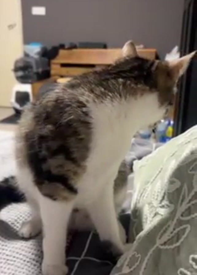 - "A white and brown tabby cat stands on a bed with a grey and maroon patterned blanket" by FM-r8nDs2, licensed under CC BY 4.0