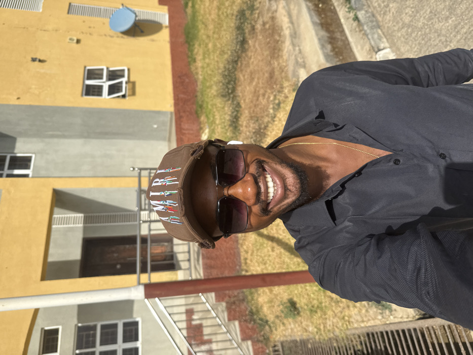 A man with dark skin, a beard, and a mustache is depicted from the chest up, smiling directly at the camera. He wears dark sunglasses, a brown distressed baseball cap with colorful vertical stripes spelling "AMIRI," a black long-sleeved collared shirt with the top few buttons open, and a thin gold chain around his neck. A white wireless earbud is visible in his right ear. The background features a two-story building under bright sunlight, with distinct sections painted in a light mustard yellow and a muted grey. The ground-level facade is reddish-brown. The building has multiple rectangular windows with white frames. On the right, a light blue satellite dish is mounted on the yellow wall. To the left of the man, a white pole with a silver railing extends upwards, next to a set of stairs leading to an entrance. The ground around the building appears to be a mix of dry grass and dirt. A concrete curb and a metal grate, possibly for drainage, are visible in the foreground on the left. The scene is outdoors, consistent with a residential or institutional area in the city of Jos, Nigeria.