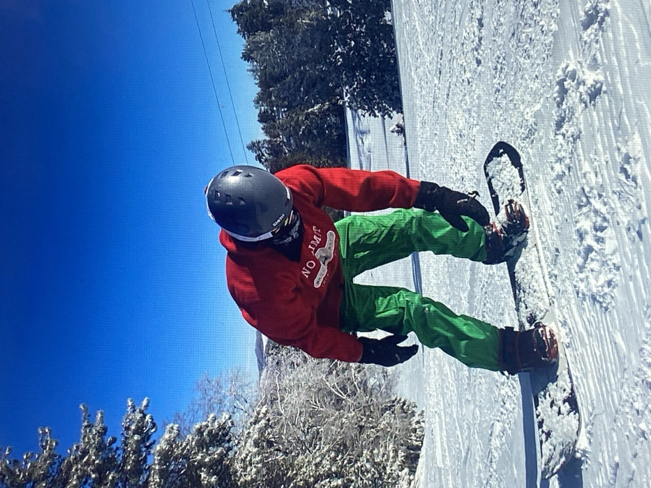 A snowboarder wearing a helmet, red sweatshirt with "NO LIMIT" printed on it, green pants, and gloves is riding downhill on a snowy slope. The sky is blue. There are trees covered in snow in the background. The photo is taken from a slightly above perspective, and the image is rotated.