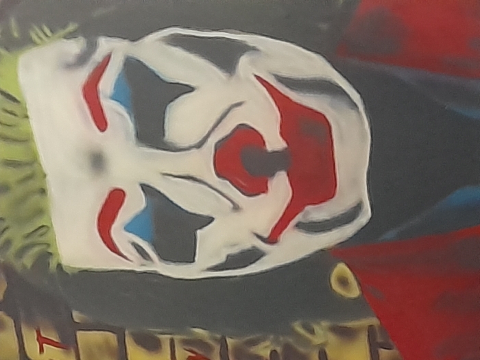 An abstract portrait depicts a clown's mask dominated by white with red accents around the eyes and mouth. The eyes contain blue and black. A shock of green hair protrudes from the side of the mask. The mask sits against a dark background with hints of red fabric nearby. Below the mask, there are indistinct shapes that appear to be illuminated blocks or squares. The overall style is reminiscent of graffiti or street art.