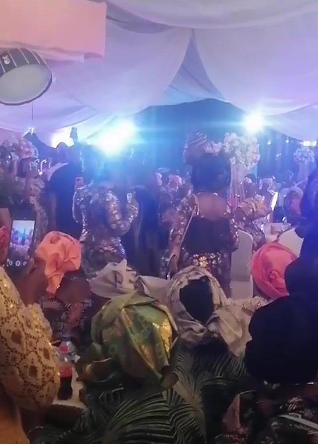 crowded, indoor event space, likely a wedding reception or similar celebration. Many people are gathered, most wearing traditional African clothing. Some are using their phones to record or photograph the event. The space is decorated with white draped fabric on the ceiling, pink and white flower arrangements, and hanging light fixtures. The lighting is primarily a purplish hue. The camera is held by someone who is part of the crowd.
