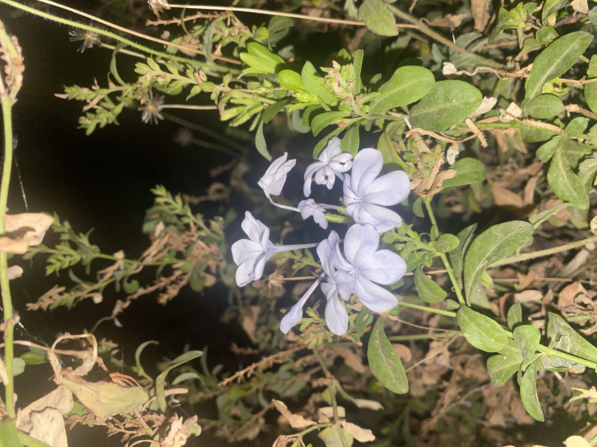 The image depicts a cluster of light blue flowers amidst green foliage and dried plant matter. The setting appears to be outdoors at night, given the dark background. The plants are located on a shrub with green and brown leaves and stems. There is no indication of people or any activity. The exact location within Barden Yana, Nigeria, cannot be determined from the image alone.