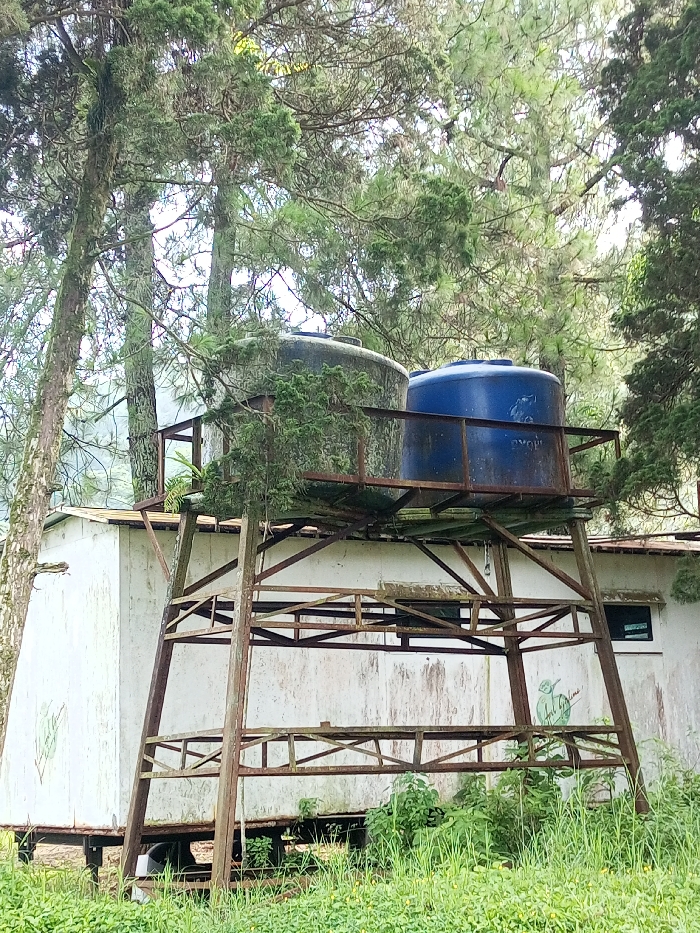 Two water tanks, one gray and one blue, sit atop a rusty metal framework. The structure is set beside a white, dilapidated building with some foliage growing on the tank and the frame. The building looks worn. A dense green ground cover surrounds the base of the structure, and tall, leafy trees rise in the background, partially obscuring the scene. The overall impression is one of age and disuse in a natural setting.