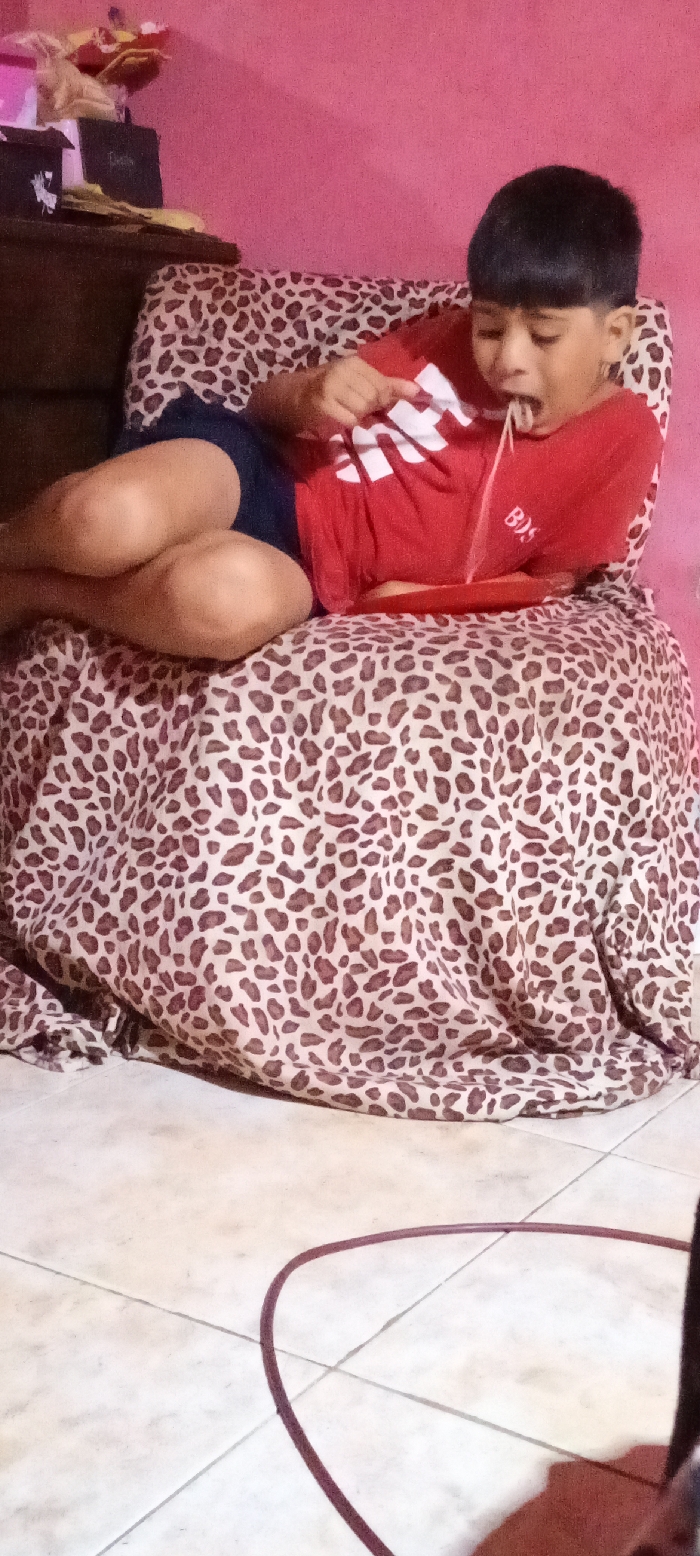 - "A young boy with short dark hair sits on a leopard-print patterned chair, eating noodles" by FM-LkkdS2, licensed under CC BY 4.0