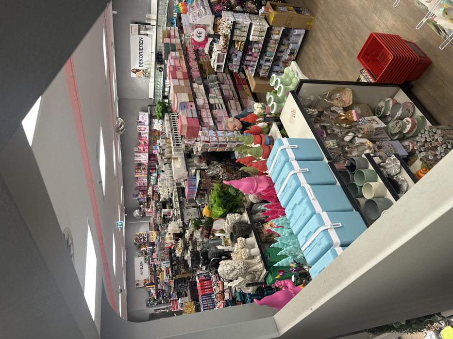 The image captures an interior view of a retail store, identified as being located in Heilbronn, Germany, from an elevated perspective overlooking the main sales floor. The store's environment features a grey ceiling with a pink horizontal accent stripe and multiple square recessed lighting fixtures. A silver disco ball is suspended from the ceiling. The walls are grey, with a green "EXIT" sign prominently displayed on the far back wall. Signage affixed to the left wall reads "SPIELEN" (Play), indicating a toy section, while a sign on the right wall reads "DEKORIEREN" (Decorate), indicating a home decor section. The flooring visible in the lower sections of the store consists of light-colored wood planks. The store is densely populated with merchandise displayed on black metal shelving units and various display tables. In the immediate foreground, a display presents five uniform light-blue rectangular coolers, each featuring white latches. Below these coolers, a shelf holds green and beige ceramic pots. To the right, a stack of red plastic shopping baskets is visible on the floor. The mid-ground of the store features extensive product displays. On the left side, decorative items include a white lion statue, grey mushroom-shaped ornaments, and a prominent arrangement of pink and green gnome figurines. Further back, numerous boxed items, many in pink and pastel packaging, are arranged on shelves, suggesting giftware or craft supplies. A red price tag indicating "4€" is visible on a shelf display. The right side of the store showcases a wide array of items, including glassware, ceramics, and additional boxed products. Two individuals are present in the scene. In the mid-ground on the left, a person wearing a dark jacket is partially visible from behind, appearing to examine items on a lower shelf. On the right, an older male with grey hair and a dark jacket is positioned near the gnome display, oriented towards the right side of the store, observing merchandise. No direct interaction between the individuals is discernible.