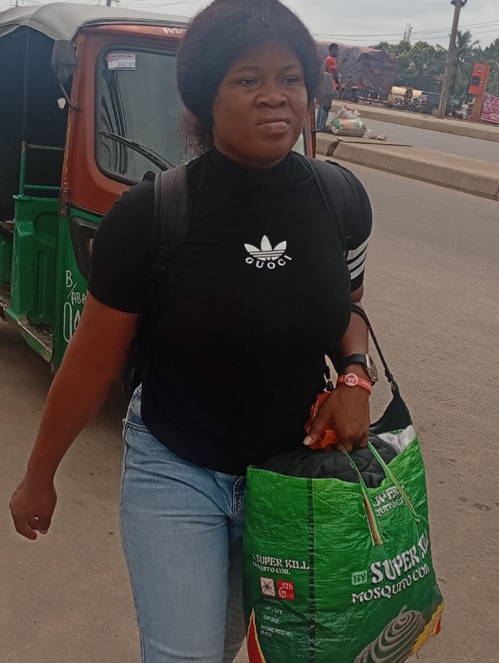 A Black female, estimated 25-35 years old, is depicted walking on a paved surface in Ura Nta Umuarandu, Nigeria