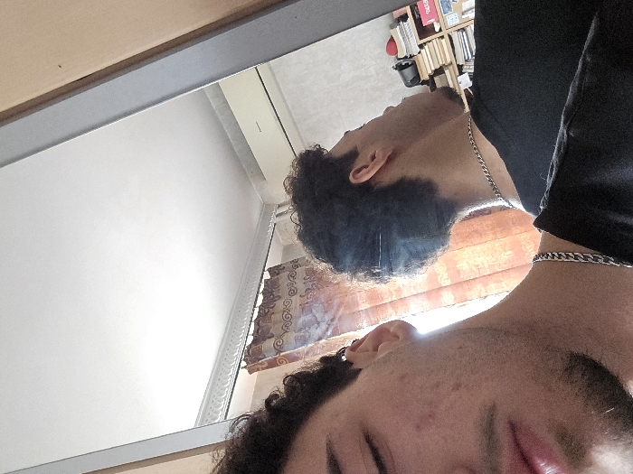 The scene depicts an indoor setting, likely a residential room in Sofia, Bulgaria, captured via a mirror selfie. A male subject's left facial profile and upper torso are visible on the left, featuring dark, curly hair, light facial stubble, and a silver-colored cuban link chain necklace worn over a black t-shirt. His left eye appears closed or downcast. The mirror reflects the subject from behind, showing the back of his head and neck, wearing the same chain and t-shirt, with his head turned to the viewer's right. The reflected background reveals a patterned curtain with scroll motifs in reddish-brown tones. Above the curtain, a white ceiling with a decorative cornice is visible. High on the wall to the right of the reflected subject, a white wall-mounted air conditioning unit is present. Further right, a light-colored shelving unit contains numerous books, stacked horizontally and vertically, alongside a red object. Natural light illuminates the room, originating from behind the curtained window area.