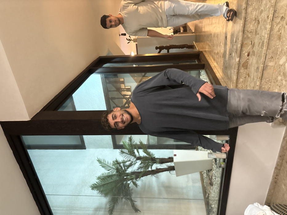 Two adult males are present in a modern indoor residential setting in Ramat Gan, Israel. In the foreground, a light-skinned male with dark curly hair and a beard, wearing a dark grey long-sleeved shirt and distressed grey jeans, stands smiling directly at the camera. He is positioned on a light-colored polished stone floor. To his left, a large floor-to-ceiling glass partition overlooks an enclosed interior courtyard or atrium, which contains two artificial palm trees set in white tapered planters filled with light-colored decorative stones. Three white pillar candles in glass holders are visible on a ledge beneath the glass partition. In the mid-ground, to the right, a second light-skinned male with short dark hair, wearing a light beige short-sleeved t-shirt and light-colored trousers, descends a set of matching polished stone steps. He wears dark sandals with white soles and is looking towards the camera. A dark wooden banister is visible behind him, indicating a staircase. The ceiling is white, and the space is illuminated by a combination of artificial lighting and ambient light filtering through the glass partition.