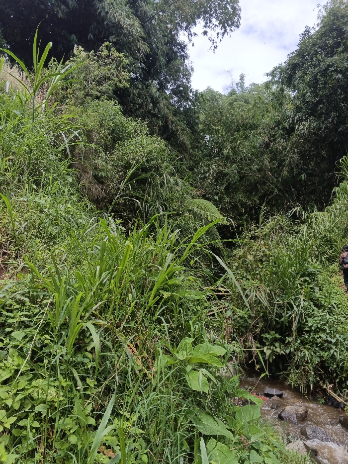 Lush, dense foliage dominates the scene, with tall grasses and leafy plants filling the foreground. A small stream flows through the right side of the image, with visible rocks and dark-toned water. Bamboo trees and various other trees form a dense canopy in the background. A person, partially obscured by foliage, stands on the right side of the image. The overall impression is one of an overgrown, natural environment.