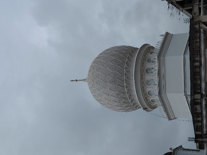 The image displays a large, white mosque dome, situated in Banda Aceh, Indonesia, under an overcast grey sky