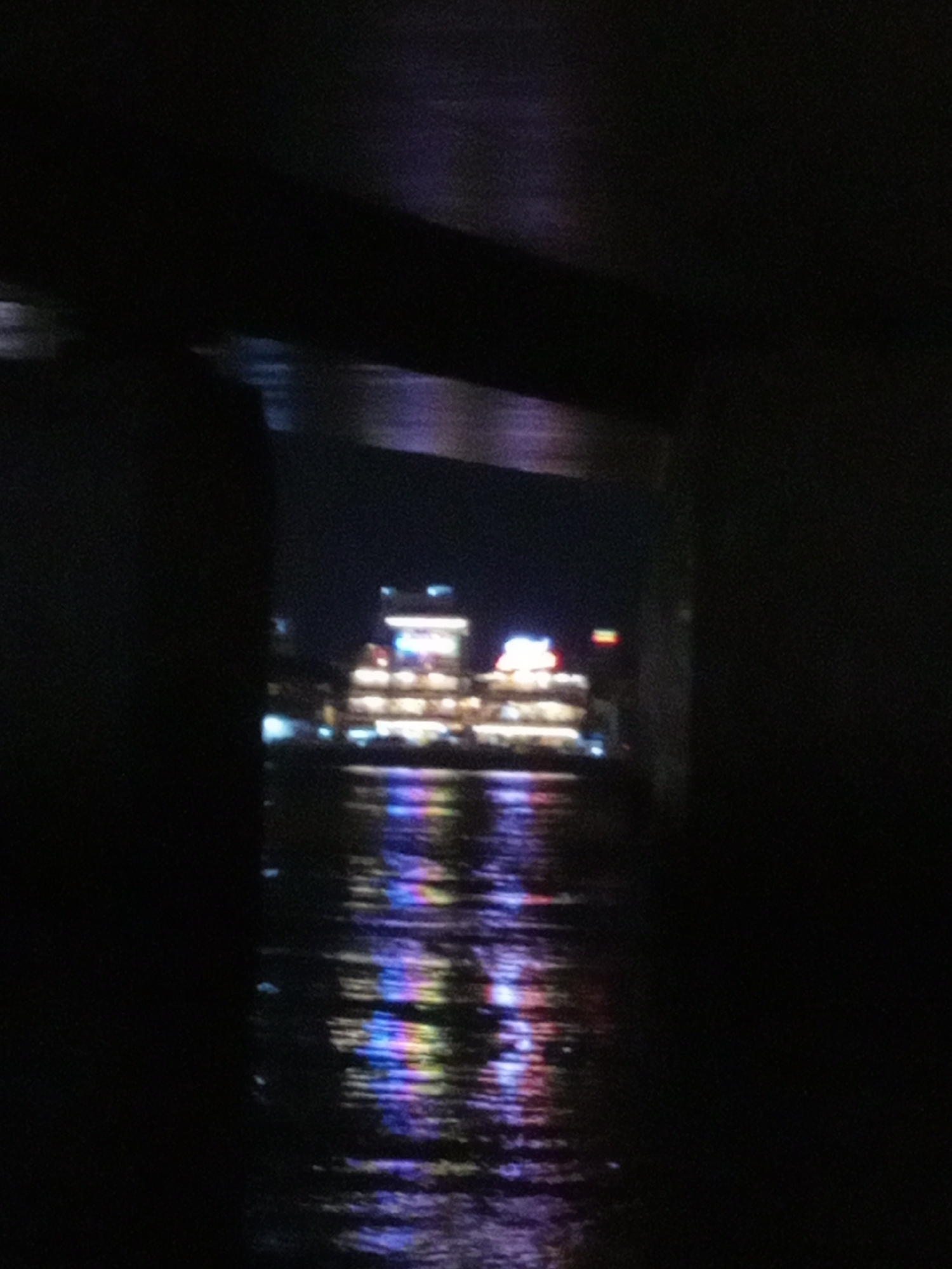 blurred, nighttime view of a lit building across a body of water. The view is framed by dark, indistinct structures, possibly a bridge or building, creating a tunnel-like perspective. The water reflects the lights from the building, creating streaks of color. The scene is likely in Natural Heritage Area Trang, Vietnam.
