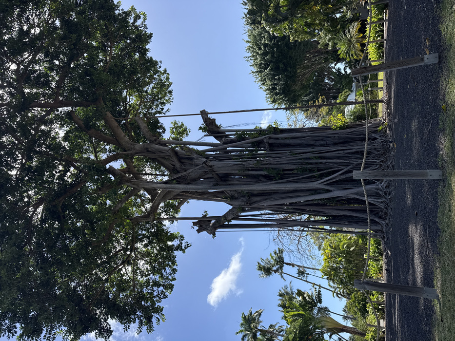 The image displays a massive Banyan tree (Ficus benghalensis) centered under a clear blue sky with scattered white cirrus clouds. The tree features an expansive, dense canopy of dark green foliage. Its central structure is composed of numerous thick, greyish-brown aerial prop roots that have descended and rooted, forming a broad, columnar base. Additional slender, unrooted aerial roots hang vertically from the upper branches. The ground immediately surrounding the tree is covered in dark, fine-grained material, consistent with volcanic gravel. A barrier, constructed from a light-colored rope strung between several dark wooden posts, encircles the base of the tree in the foreground. In the background to the left, multiple tall, slender palm trees and other tropical vegetation are visible. To the right, dense green foliage forms a backdrop, with a faint, light-colored structure partially visible behind it. No individuals are present in the scene, nor are any direct actions or interactions discernible. Location: Unknown, Unknown.