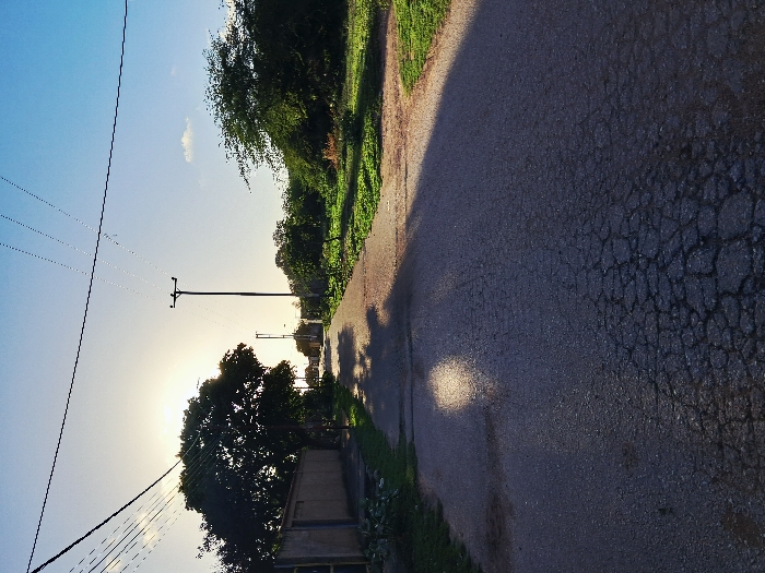 An asphalt road winds through a landscape under a clear blue sky. Green vegetation lines the road's edge, contrasting with the road's dark surface and textured appearance. Utility poles stand beside the road, wires stretching into the distance. Sunlight casts elongated shadows across the road.