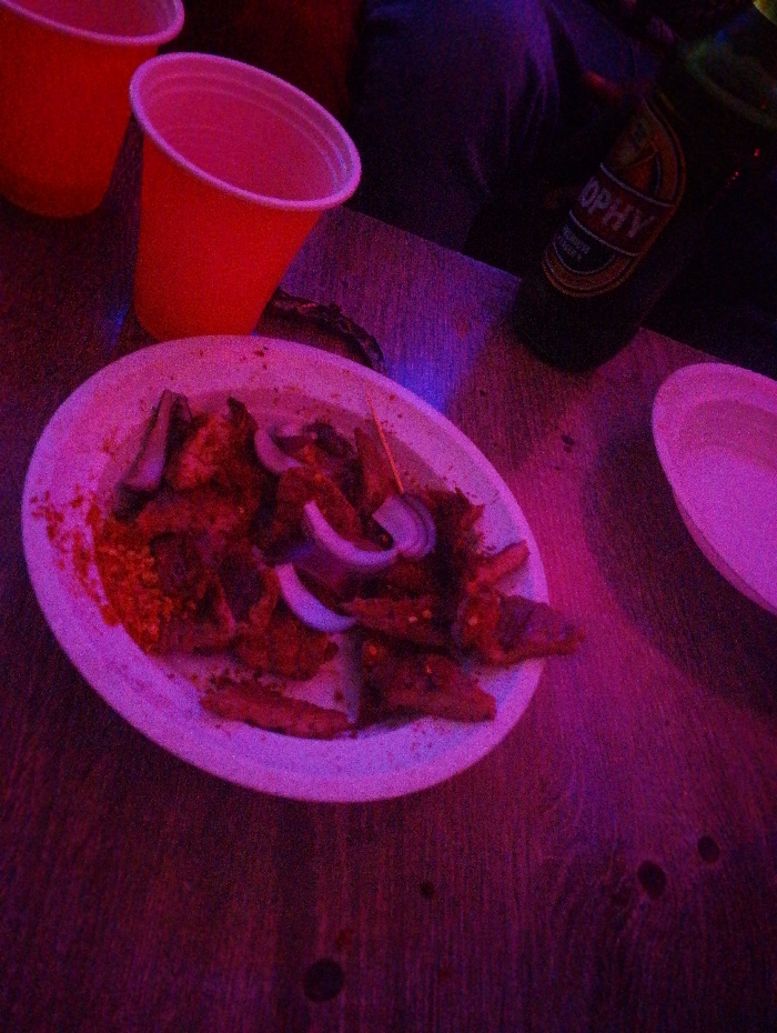 The image displays a table scene under pervasive, dim purple-pink lighting. A white, round plate, positioned slightly left of the image center, contains multiple irregular pieces of dark, fried or grilled meat, garnished with white, sliced raw onions and a reddish-orange spice powder, consistent with yaji. A single toothpick is embedded within the food. Two red plastic cups are visible in the upper-left corner. A dark glass bottle, identifiable by its label as "TROPHY" beer, stands upright on the table in the upper-right quadrant. A portion of another white, empty plate is visible on the far right edge. The table surface exhibits a wood grain pattern. The background is dark and indistinct, consistent with an indoor commercial or social establishment. No individuals are discernible. The specific location within Jos, Nigeria, is not identifiable from the visual content of the image.