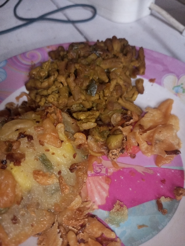 The image displays a meal served on a decorative round plate in Ciherang, Indonesia. The plate features a pink background with a cartoon princess design and a white border with purple and white swirls. The meal consists of two primary components. In the upper portion of the plate, there is a pile of brownish-yellow, textured food, appearing to be a sautéed or stewed dish, possibly containing vegetables or meat, with some darker green pieces visible. In the lower portion, a large, light-yellow, flat, fried item, resembling a fritter or bakwan, occupies a significant area. This item has crispy, golden-brown edges and scattered darker fried fragments. The background consists of a light-colored surface, possibly a floor or table, with a dark, coiled electrical cord visible in the upper left. No people are present, and no actions or interactions are depicted.