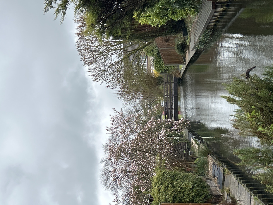 This image captures a view of a narrow residential canal in Sliedrecht, Netherlands, under an overcast sky. The calm, dark water of the canal extends from the foreground into the midground, reflecting the muted light from above. The left bank features a concrete-capped retaining wall with vertical dark wooden planks. Above this, a dense green hedge is present, followed by a large deciduous tree covered in numerous light pink blossoms, likely a magnolia. A dark wooden structure, possibly a bench or low platform, is partially visible beneath this tree. Further back, another green shrub is visible. The right bank features a dark wooden retaining edge and a low wooden platform. A tall, slender evergreen tree stands prominently, adjacent to a vertical wooden fence. Beyond the fence, a residential house with a dark-tiled pitched roof and white window frames is visible through tree branches with emerging foliage. A pedestrian bridge constructed of dark wood crosses the canal in the midground, featuring dark railings and a dark deck. Beyond the bridge, a paved road is visible, with at least two parked passenger vehicles; one appears red, the other white. Additional residential structures are partially visible in the distance through the trees. The sky is uniformly overcast and light grey, lacking direct sunlight. No individuals or animals are visible within the scene.