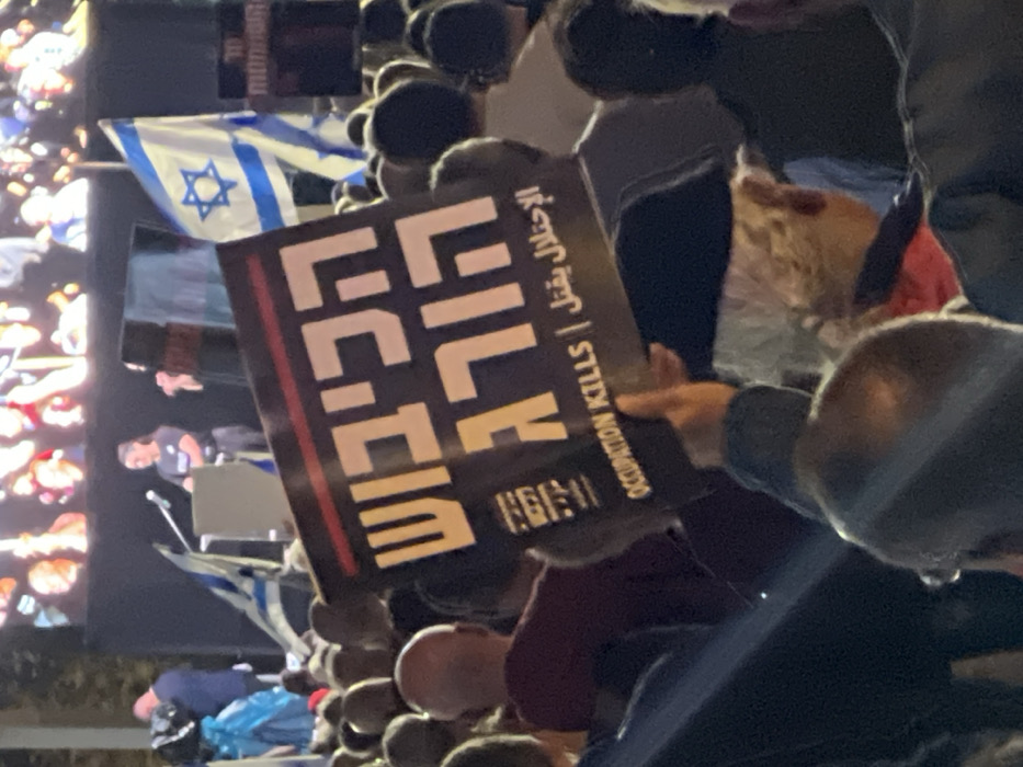 A protest sign reads "Occupation Kills" in English and Arabic, and "Lila" in large, white block letters with the last name in Hebrew below. An Israeli flag is visible in the background. The crowd is close together and dense, appearing to be in a public space. The lighting suggests the photo was taken at night or in dim conditions.