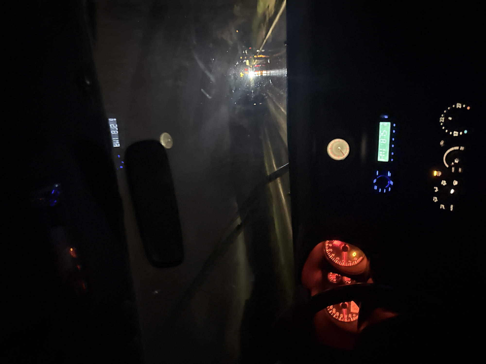 interior of a vehicle, likely a bus or truck, at night. Through the windshield, there are vehicles with headlights visible in the distance. The dashboard is illuminated, displaying various gauges, including a speedometer with orange numbers and a digital display showing "FM 81.5". The vehicle appears to be in motion. The location is unknown. There is no indication of Parvomaitsi, Bulgaria.