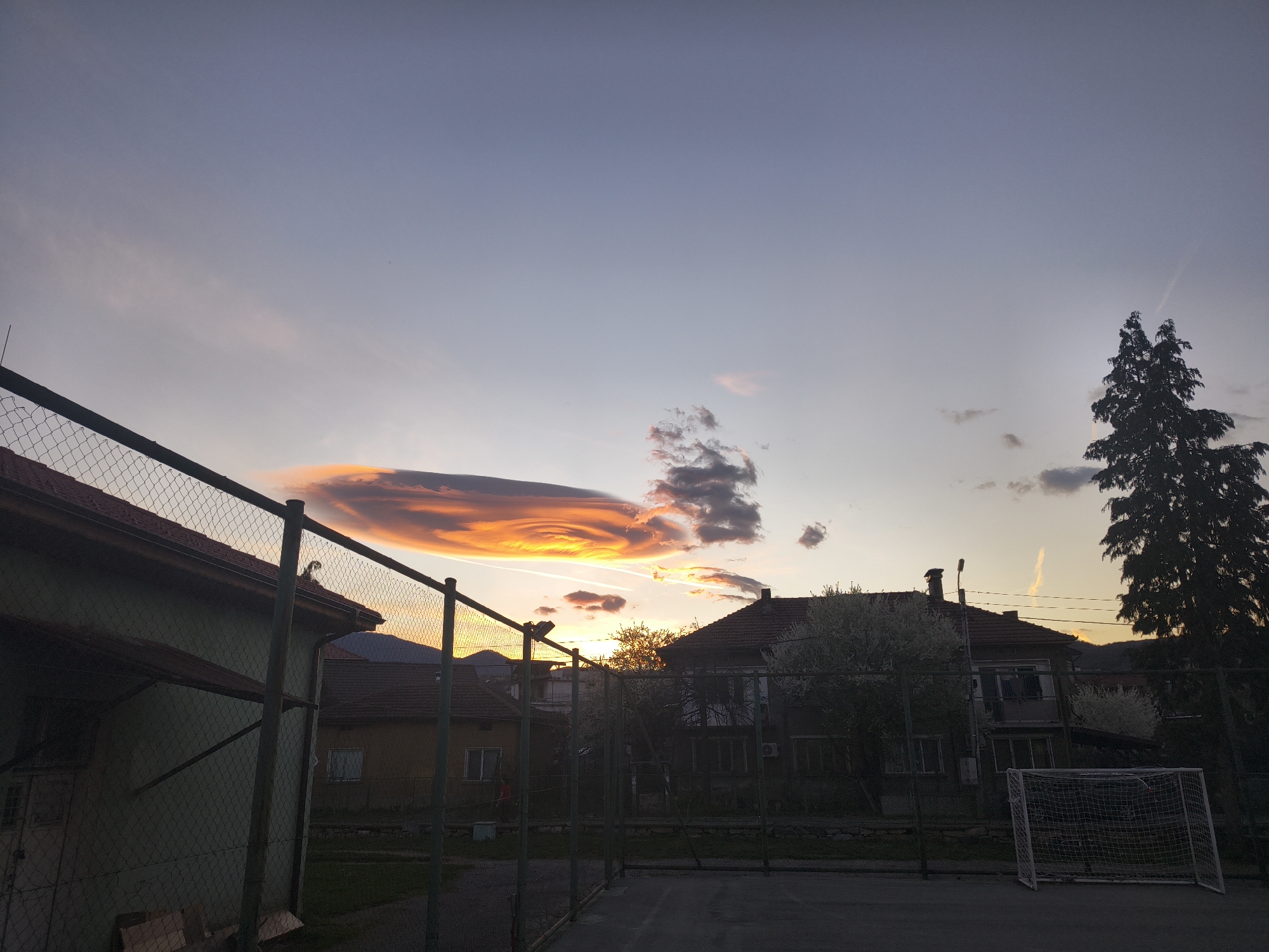 The image captures a dusk scene in Berkovitsa, Bulgaria, featuring a soccer field with a goal in the lower right corner. A chain-link fence runs across the midground, partially obscuring houses and foliage. Buildings with tiled roofs are visible behind the fence. In the sky, a distinct lenticular cloud formation is prominent, displaying layers of orange and yellow hues, near another cloud mass. A contrail is visible in the right portion of the sky. The light suggests the sun is setting. The scene appears still and devoid of people. The ground surface is a paved dark surface with some grass growing through cracks.