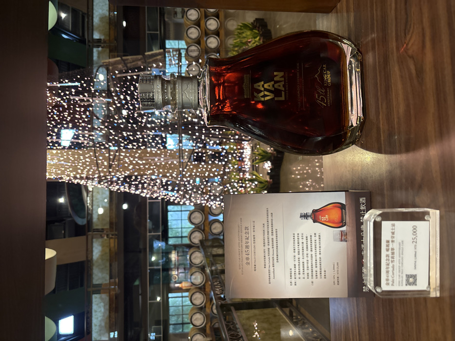 The image depicts an indoor display at the Kavalan Distillery in Yuanshan, Taiwan