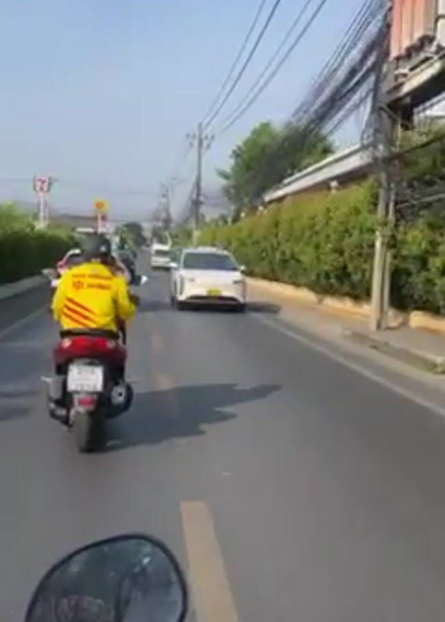 A person riding a red and black scooter is driving on a road in what appears to be a city. The rider is wearing a yellow shirt with red stripes. There are other cars and vehicles on the road, including a white Lexus RX and a white taxi with a futuristic design. The road has yellow lines marking the lanes. The sky is blue and clear. There are power lines and a 7-Eleven store visible in the background. The video is shot from the perspective of someone riding another scooter.
