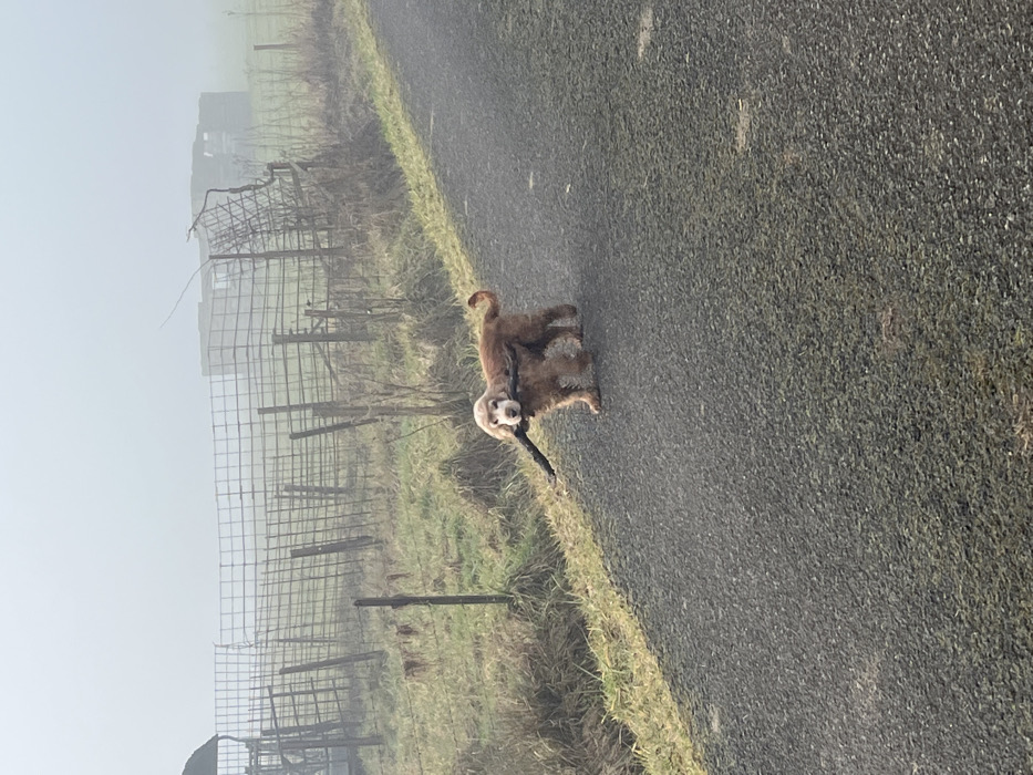 - "An outdoor scene in Mondercange, Luxembourg, depicts a medium-sized, light brown, fluffy-coated dog, possibly a Cocker Spaniel, with lighter fur around its muzzle, walking on a dark grey paved path" by FM-CPrh43, licensed under CC BY 4.0