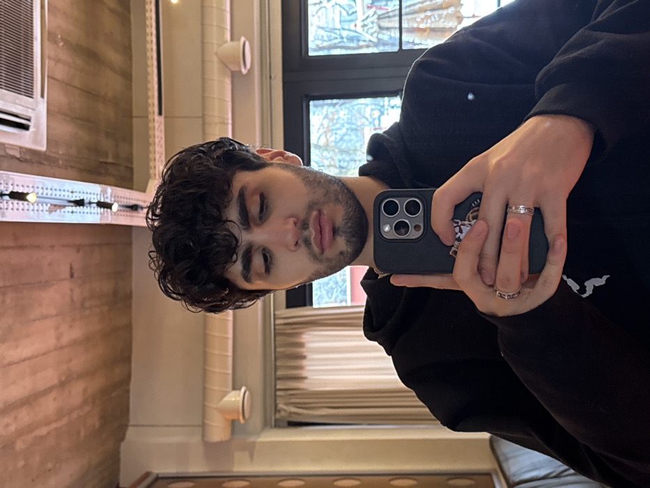 A selfie captures a man with dark curly hair and a stubbled beard. He's holding a dark-cased iPhone, adorned with a sticker, in his right hand, which also displays two rings. He is wearing a black hoodie. Behind him, a window shows a blurred outdoor scene, while the interior reveals a wooden wall, a white pipe, and a hanging light. The image is rotated, making the scene appear sideways.