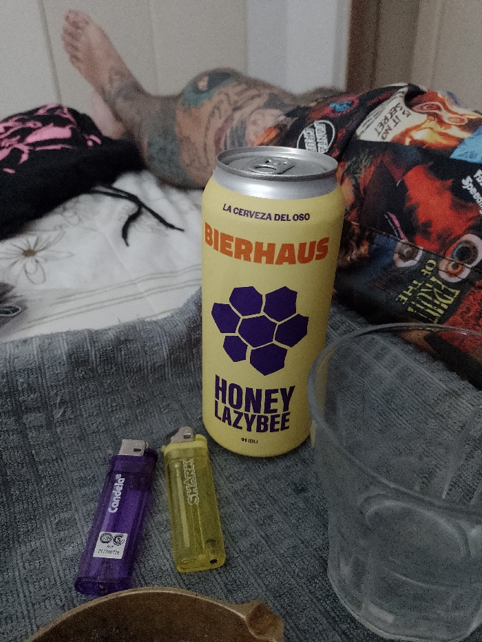 - "A scene on a bed includes a can of "Bierhaus Honey Lazybee" beer, two lighters (purple "Candela" and yellow "Shark"), and a glass" by FM-gHayn1, licensed under CC BY 4.0