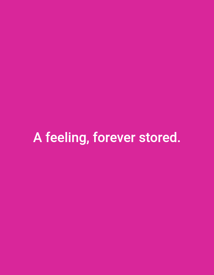 The image is a solid pink background with the text "A feeling, forever stored