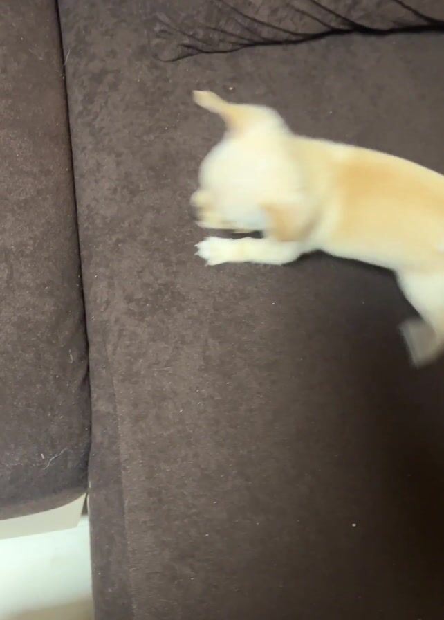- "small, short-haired, tan Chihuahua dog rolling and twisting on a brown couch" by FM-5O5Mr1, licensed under CC BY 4.0