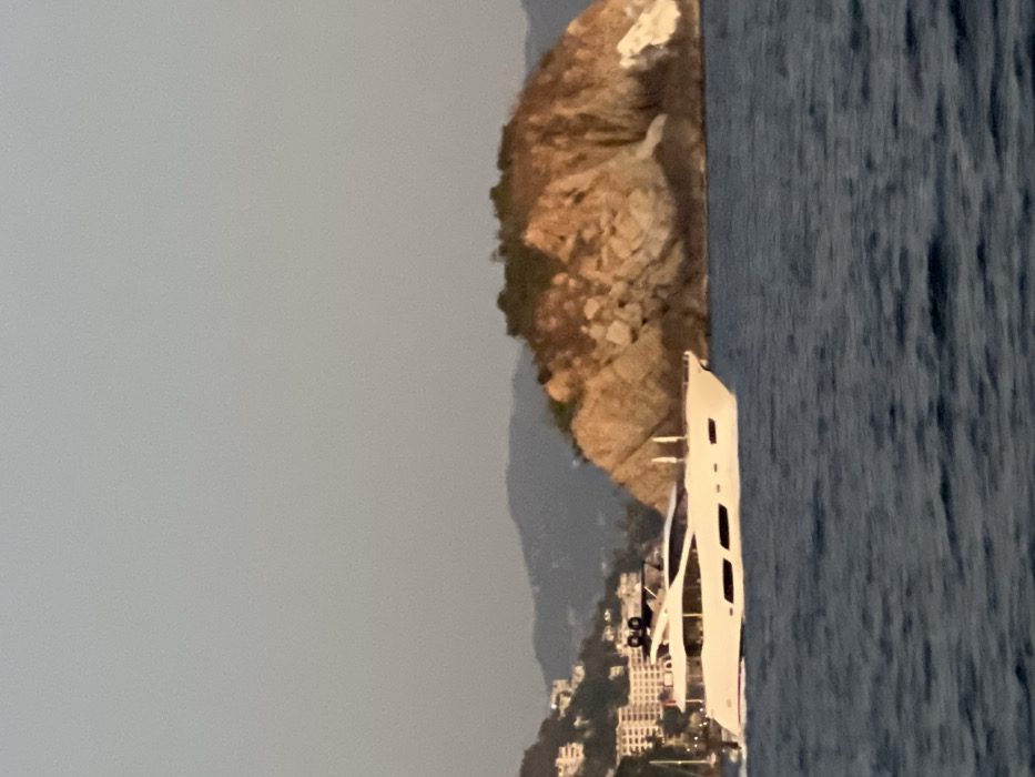 A coastline meets the ocean. Hilly terrain rises from the shoreline, and buildings dot the base of the hills. A large, white yacht is moored in the water, close to the shore. The sky is overcast and a uniform grey. The ocean surface is textured and slightly rough.