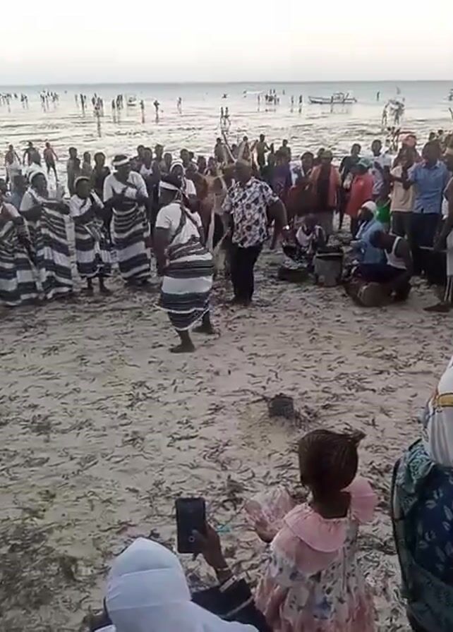 group of people performing a traditional dance on a beach. A large crowd of people are gathered on the sandy beach, with many standing on the exposed sandbar in the ocean. The ocean is visible in the background. A man in a patterned shirt and black pants is dancing in the center of a circle formed by women in white and black striped outfits. Behind the dancers are people playing drums and other instruments. In the foreground, people are filming the dance with their phones. The overall atmosphere appears festive and celebratory.