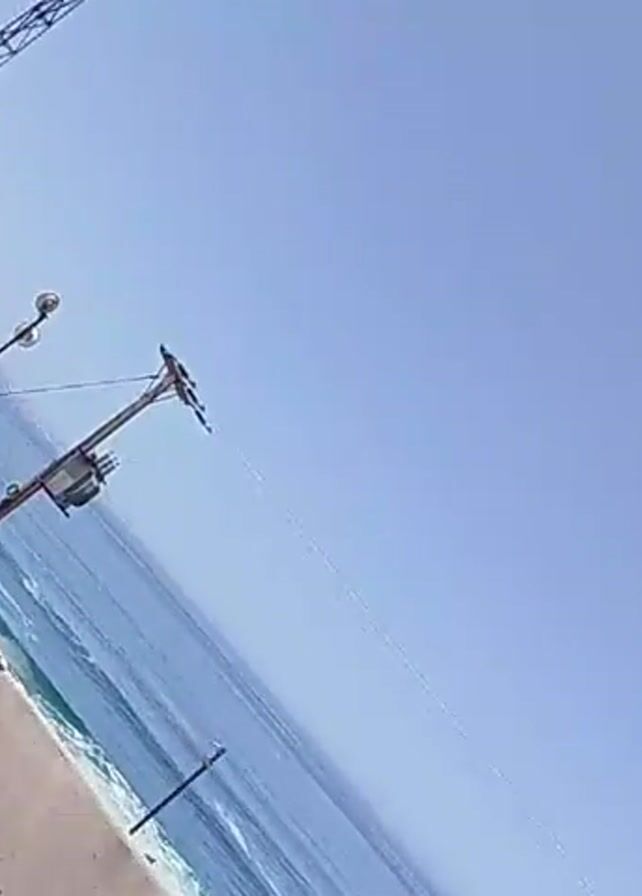 coastal scene. The camera is positioned at an angle, looking out towards a blue ocean under a clear, light blue sky. The edge of a concrete walkway or road is visible in the foreground on the left. There are some poles and towers visible along the coast, as well as graffiti on the concrete. The waves are small and gentle.
