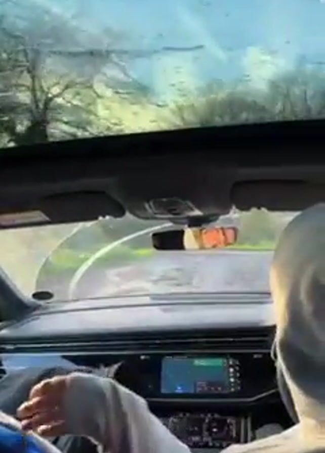 interior of a car with a panoramic sunroof. It’s raining, and the windshield wipers are in motion. A person in a white hoodie is driving, their right hand visible on the steering wheel. A jacket is on the passenger seat. The car is driving down a winding road lined with trees.