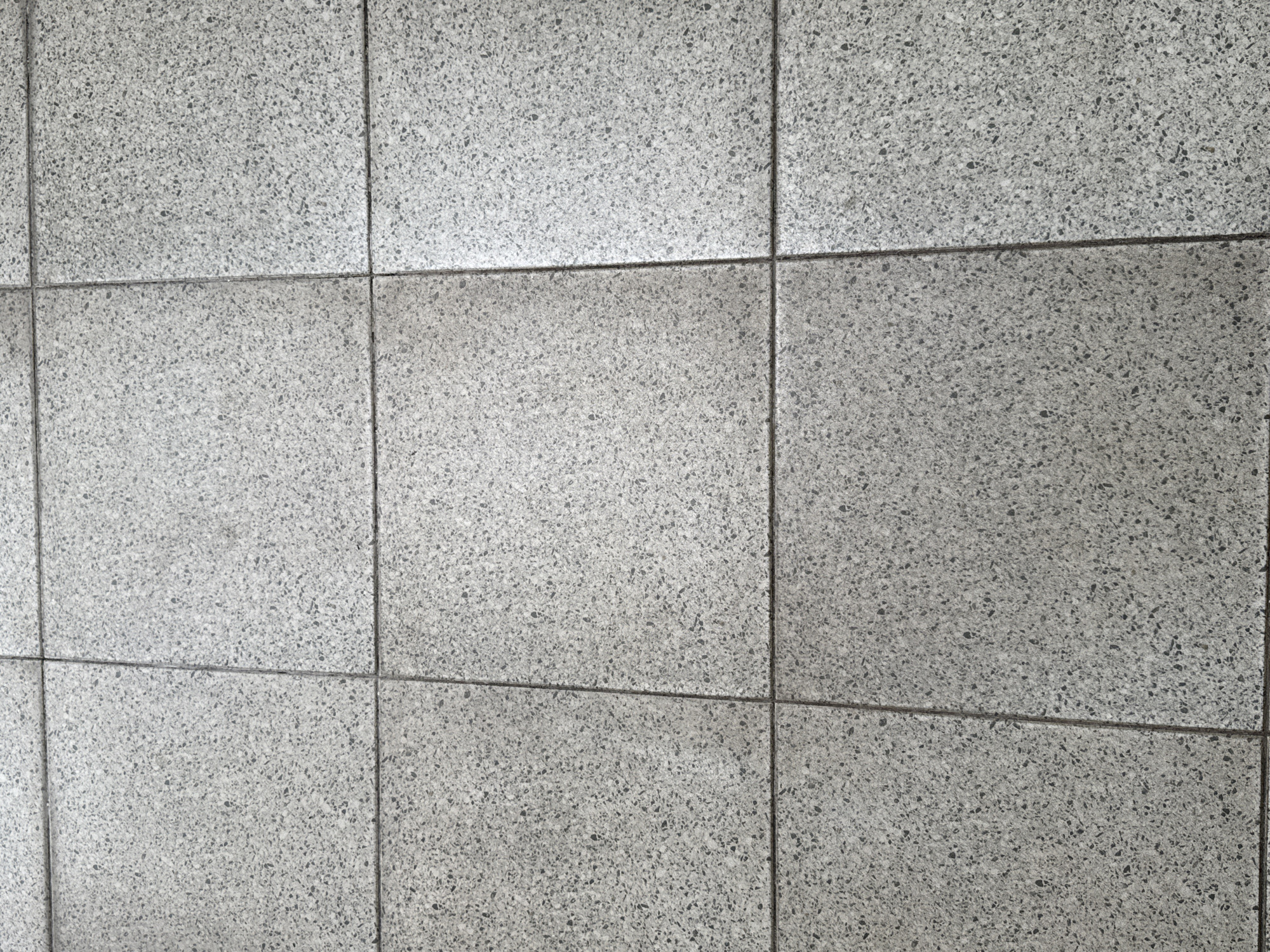 The image displays a tiled floor surface, situated in Bekasi, Indonesia. The floor consists of multiple square tiles arranged in a rectilinear grid, viewed from a slightly elevated, downward-angled perspective. Each tile is light grey with numerous small, irregularly shaped dark grey to black aggregate speckles, characteristic of a speckled ceramic or terrazzo material. The tiles are delineated by thin, darker grey grout lines. The surface appears to be generally clean, with minor variations in light reflection and subtle discoloration present within some grout lines. No individuals, objects, or actions are depicted within the frame.