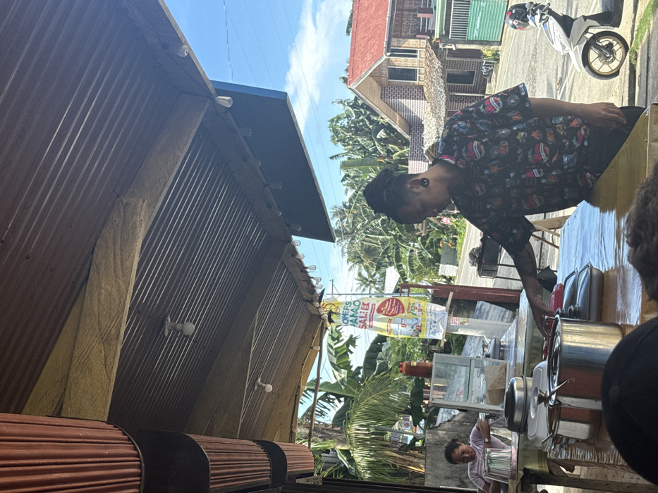This image depicts an outdoor or semi-enclosed eatery located in Burgos, Philippines, under bright daylight conditions. A person with dark dreadlocks, wearing a short-sleeved patterned shirt and black ear gauges, stands behind a counter, extending their right hand towards a lidded container on the counter. Visible on the counter are multiple lidded stainless steel pots, additional lidded rectangular containers, a stack of light-colored cups, and a clear glass display case with unidentified contents. To the left, a second individual, a woman in a light-colored t-shirt, is seated at a table, looking downwards. The eatery's structure includes a corrugated metal roof, exposed wooden beams, and multiple visible lightbulbs. Beyond the eatery, an asphalt road curves to the right, bordered by dense tropical vegetation, including numerous palm and banana trees. A tall, colorful banner advertising "WOMERS PANAO SALE!" is erected roadside on the left. On the right side of the road, a two-story house with a red-orange corrugated roof and brick-patterned siding is visible, positioned above a smaller structure with a textured brown roof. A white scooter with a helmet on its seat is parked on the roadside near the houses. The sky is clear blue with minimal cloud cover, and overhead utility lines are discernable.