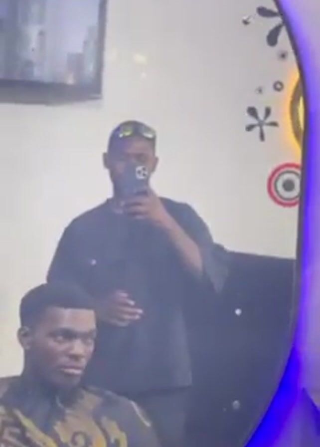 A man is sitting in a barber chair wearing a decorative cape, and the barber is standing behind him taking a selfie with his phone. The room is decorated with modern designs, including a television and illuminated wall art. There is music playing in the background.