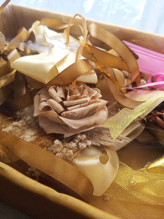 The scene, located in Qarabucaq qəsəbə, Azerbaijan, presents a close-up, high-angle view of a decorative arrangement contained within a gold-lined box. Centrally positioned is a light beige fabric flower, approximately 7 cm in diameter, constructed from layered and folded material to resemble a rose. Surrounding the flower are multiple strands and loops of various ribbons: gold satin, cream satin, and a textured gold ribbon. Small clusters of dried white botanicals and dried straw-like elements are interspersed around the base of the fabric flower. A faint pink object is partially visible in the upper right background. The interior of the container is consistently lined with a gold satin fabric. No individuals are visible.