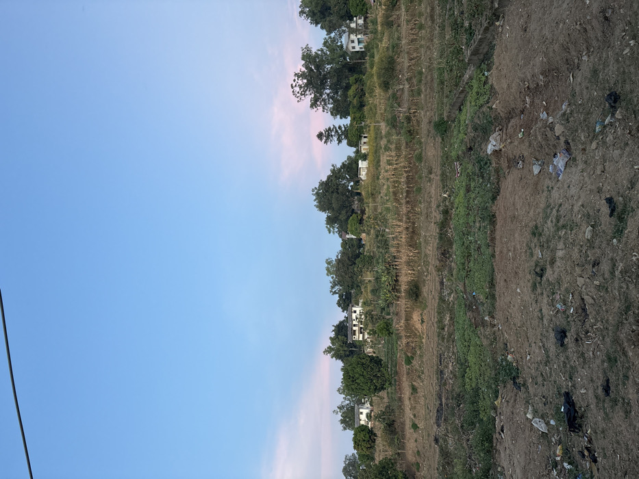 The image presents a daytime exterior scene in Jos, Nigeria, under a predominantly clear blue sky exhibiting a subtle pinkish gradient along the horizon, indicative of either dawn or dusk. A thin, dark linear object, possibly a utility wire, traverses the upper left corner of the frame. The midground features a gently sloping hillside characterized by diverse vegetation, including numerous mature green trees and sections of cultivated land with both green crops and dried, brown stalks. Scattered across this hillside are several white-colored, single to two-story residential structures. The foreground consists of uneven, exposed brown earth with intermittent patches of low-lying green vegetation, suggesting agricultural use. This immediate foreground area is significantly cluttered with scattered refuse, predominantly white and black plastic bags, and other non-organic debris. No individuals, animals, or active interactions are visible within the frame.
