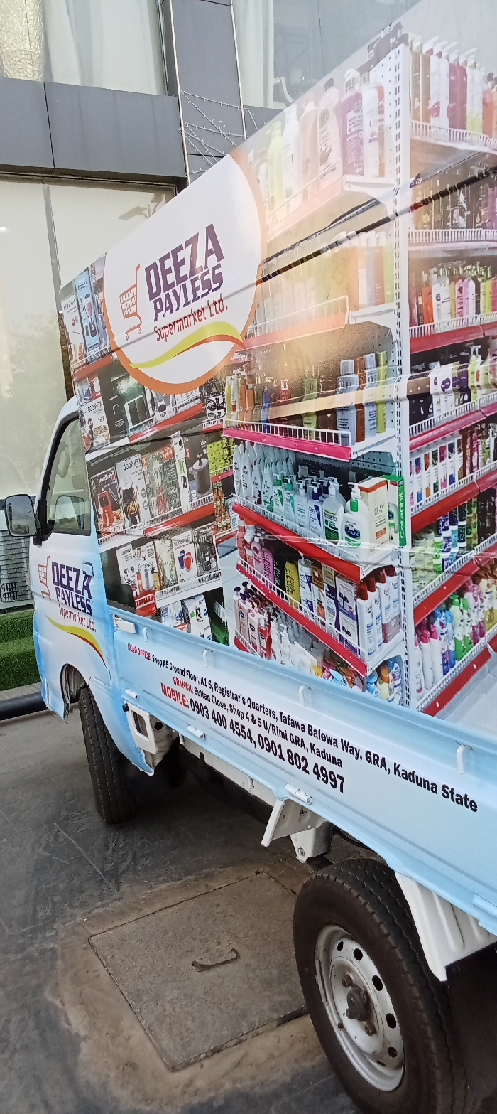 This image captures a light-duty flatbed truck, mostly white with light blue accents, parked on a dark paved surface in Kaduna, Nigeria. The prompt specifies the location as Kabala, a district within Kaduna. The truck is extensively covered in a full-body advertising wrap for "DEEZA PAYLESS Supermarket Ltd." The wrap displays vibrant photographic representations of supermarket shelves. The left side of the truck depicts shelves stocked with various household appliances and electronics, such as blenders, toasters, and coffee makers. The rear and right side of the truck feature shelves laden with personal care products, including shampoos, conditioners, lotions (e.g., Dove, Olay, Cetaphil), and other toiletries. The "DEEZA PAYLESS" logo, incorporating a shopping cart icon, is prominently displayed multiple times on the wrap. Printed in black text on the light blue side panel of the flatbed, contact information is visible: "HEAD OFFICE: Shop A5 Ground Floor, A1 6, Registrar's Quarters, Tafawa Balewa Way, GRA, Kaduna State" "BRANCH: Sultan Close, Shop 4 & 5 U/Rimi GRA, Kaduna" "MOBILE: 0903 400 4554, 0901 802 4997" The immediate ground beneath the truck is a dark, possibly asphalt or concrete, surface with a rectangular metal manhole cover visible near the rear wheel. In the background, a modern building with large reflective glass windows and dark gray paneling is visible, suggesting a commercial or institutional structure. No individuals are present, and no specific actions or interactions are depicted. The lighting indicates daytime conditions.