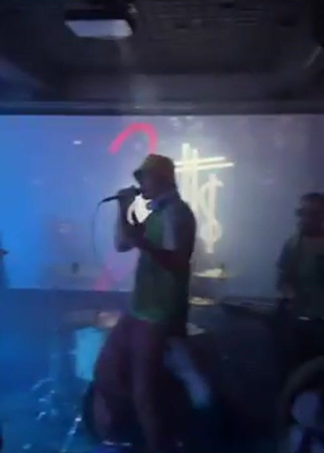 A band is performing on a small stage at a concert. The lead singer, a man in a bucket hat, green vest, and baggy pants, is dancing and singing into a microphone. Behind him, a guitarist and drummer are playing. A screen projects the band's name, "2Watts$", in neon-style graphics. The stage and audience are lit with blue lighting. The audience is standing and filming the performance with their phones. The venue appears to be a small, low-ceilinged club.