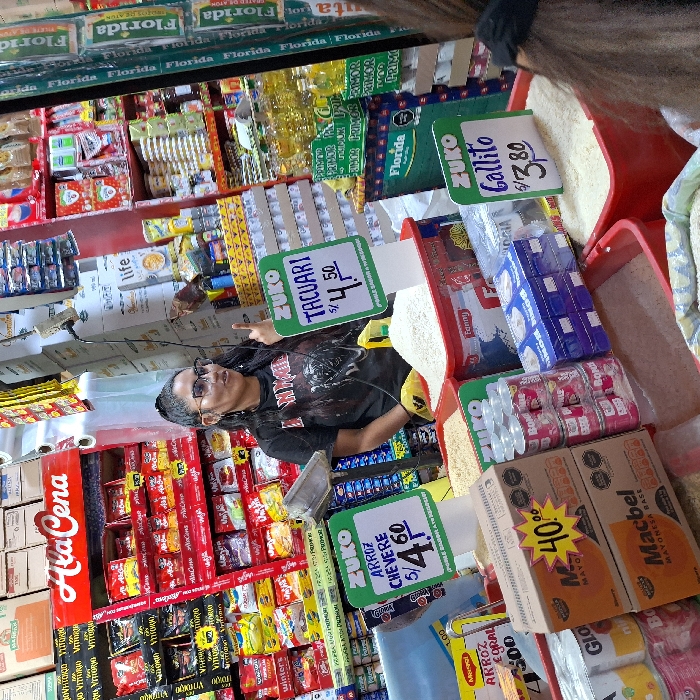 A woman stands in a grocery store aisle packed with goods. A prominent "Ala Cena" display is visible. Various products are showcased with price tags, including "Zuko Gallito" at S/3.80, "Zuko Tacuari" at S/4.50, and "Arroz Chevere" at 5/4.60. A box of "Macbel" mayonnaise base is marked at M/40.00. "Florida" products line the upper shelves, and brands like "Vittorio" and "Life" are also visible.