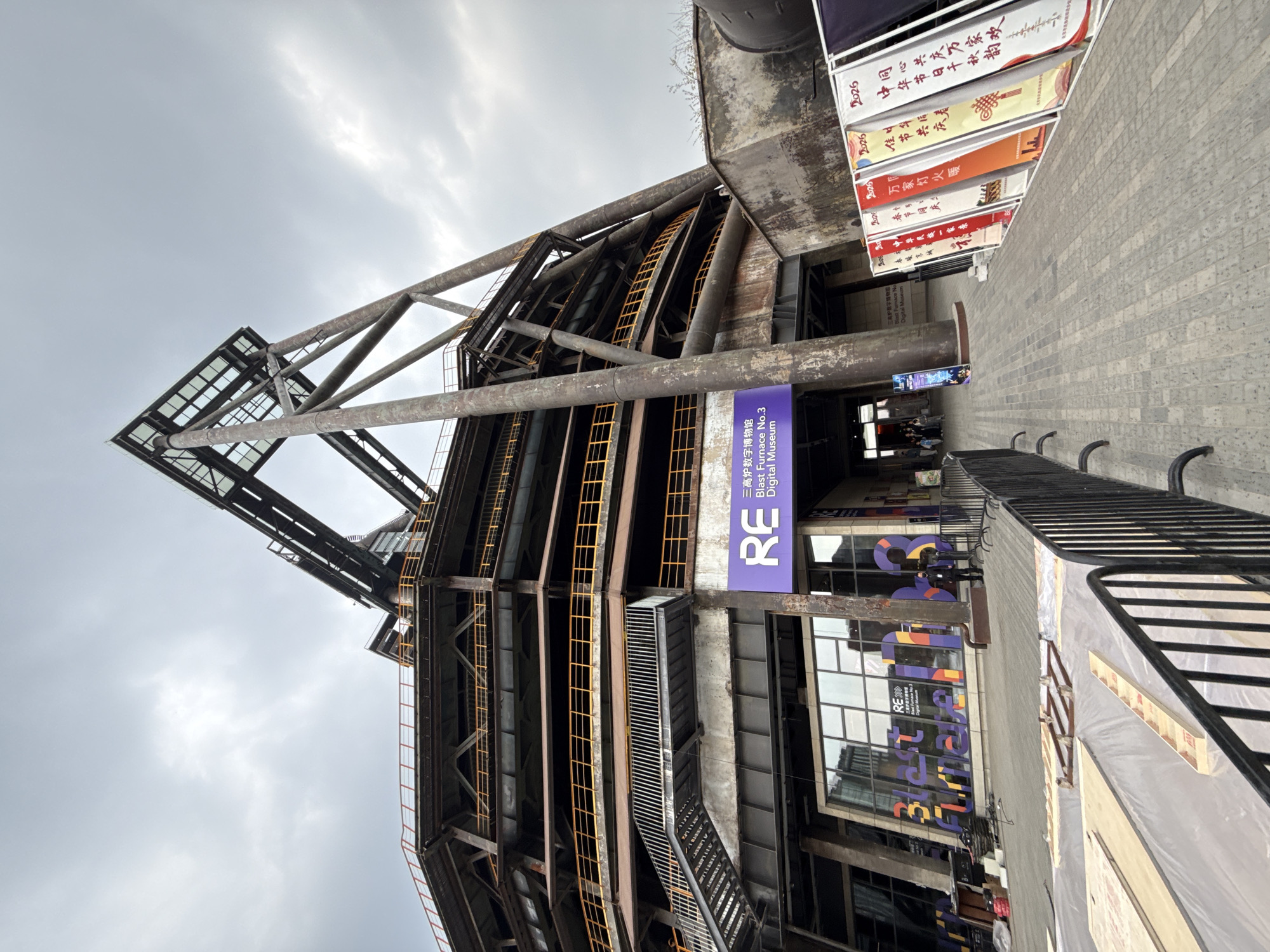 exterior of the Blast Furnace No. 3 Digital Museum in Shijingshan District, Beijing, China. The museum is an industrial-style building with a steel frame structure and yellow ladders. A sign for the museum is visible in the foreground. Banners with Chinese characters are hung above the entrance. The sky is cloudy.
