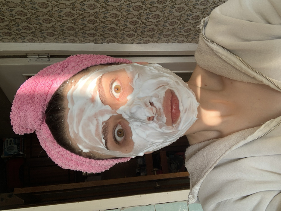 The image displays a close-up, frontal portrait of an individual, presumed female, in an indoor setting. The subject's face is coated with a thick, white, foamy substance resembling a facial mask, leaving the eyes, nostrils, and mouth visible. A pink terry cloth headband or towel is wrapped around the head, securing the hair. The eyes are wide open, exhibiting different iris colors—one appears brown, the other a lighter hazel or greenish-brown, indicating potential heterochromia or differential lighting. The lips are slightly parted and appear distended. The individual wears a light-colored, possibly off-white, hooded garment with a visible zipper down the front. Strong sunlight illuminates the subject from the left side. The background features a dark wooden door or cabinet to the left and a wall adorned with patterned wallpaper on the right, depicting a repeating floral motif in muted tones. A white door frame is partially visible on the right edge of the frame. The precise location within the city of Yerevan, Armenia, cannot be determined from the visual evidence presented in the image.