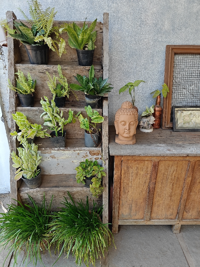 The image displays a decorative arrangement situated within what appears to be an interior or covered exterior space, consistent with a residential or commercial setting in Alappuzha, India. On the left, a weathered, light brown wooden tiered stand, resembling a ladder, features five levels. These levels hold a total of ten potted plants in black or dark gray containers. The plants vary in species, including ferns, snake plants, and broad-leaved variegated foliage. At the base of the stand, on the light gray concrete floor, two larger pots contain dense clumps of long, green, grassy plants. To the right, a rectangular, weathered wooden cabinet with a flat top surface and two visible panel doors stands on the same light gray concrete floor. The cabinet top supports several decorative objects. Centrally positioned is a terracotta-colored bust of Buddha. Behind the Buddha bust, a clear glass bottle holds a small green plant sprout. To its right, a smaller, textured ceramic pot contains a miniature variegated plant. Further right, a slender, copper-toned bottle also contains a small green plant sprout. A large, empty rectangular wooden frame with a wire mesh insert leans against the wall behind these items. In front of this frame, a smaller framed image, appearing aged and possibly depicting an animal such as a horse or deer, rests on the cabinet. The background wall is a textured, light gray surface. No individuals are present in the scene. The overall arrangement suggests a curated display of natural elements and decorative items.