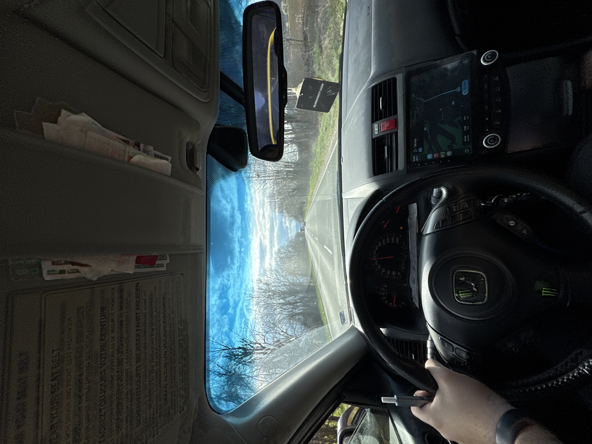 A first-person view from inside a car traveling on a road, with the driver's hand visible on the steering wheel