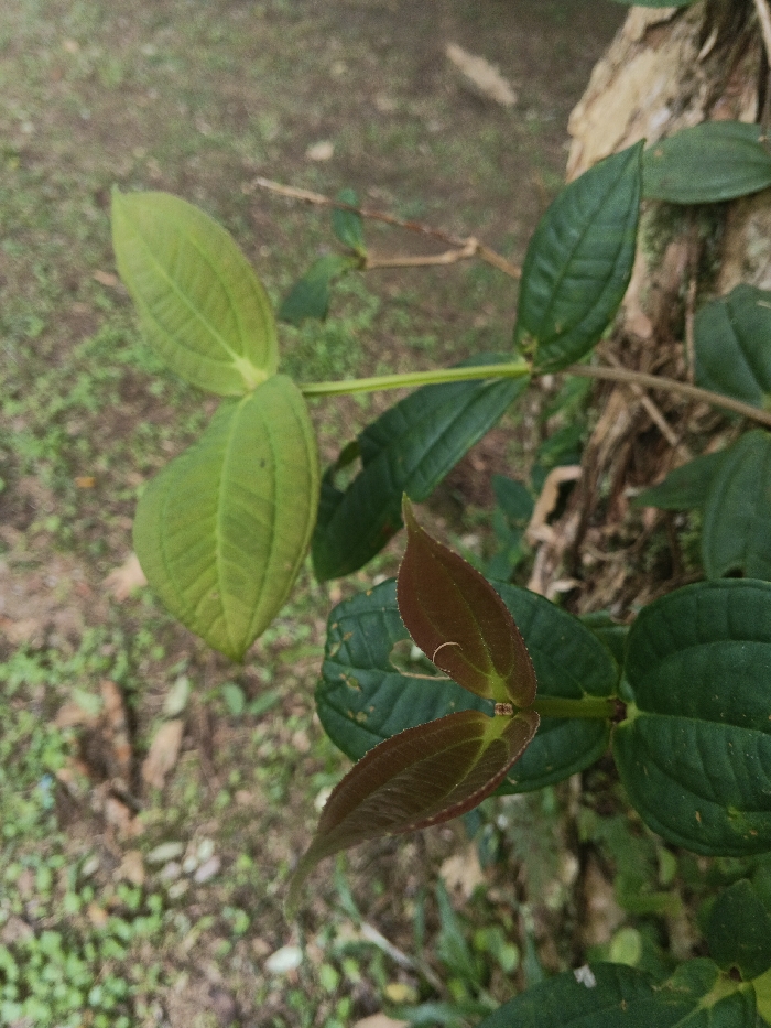 The image presents a close-up, overhead view of a plant, likely a vine, growing outdoors. The specific location within Munyati, Zimbabwe, is not discernible from the visual content. The primary subjects are a cluster of leaves and stems. In the upper left quadrant, two light green, elliptical leaves with prominent, parallel venation are visible. Directly to their right and slightly below, several darker green, more mature leaves with visible textures and some minor surface irregularities are present. These leaves are attached to a slender, green stem. Emerging from the lower center, two reddish-brown, pointed leaves, indicative of new growth, are prominently featured, linked by a thin green stem. A segment of a textured, light brown tree trunk, with vertical furrows, occupies the right side of the frame. The background is out of focus, showing blurred patches of brown soil, sparse green ground cover, and some scattered organic debris. No individuals, animals, or man-made objects are present in the scene.