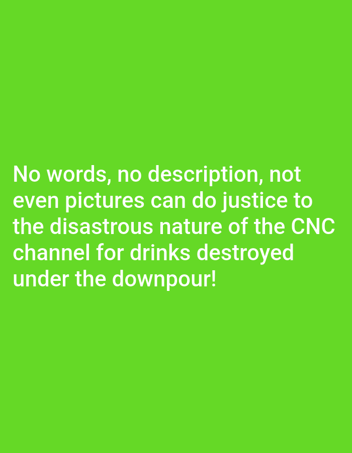 The image, contextualized within the city of Khan Yunis, Palestinian Territory, displays a solid lime green background. White, sans-serif text is centrally positioned in the lower portion of the frame. The text reads: "No words, no description, not even pictures can do justice to the disastrous nature of the CNC channel for drinks destroyed under the downpour!" No individuals, physical objects, specific actions, interactions, or discernible environmental elements are visually present beyond this text on the monochromatic background.