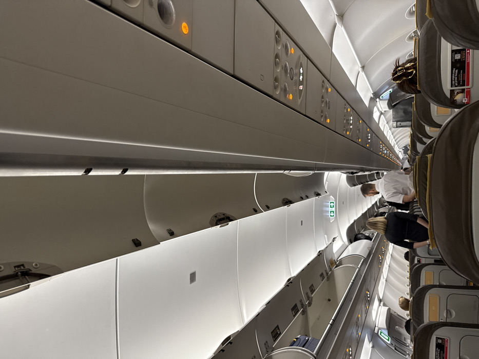 interior of an airplane cabin, viewed from the aisle. Overhead compartments line the top left. A row of passenger seats is visible on the right, with people standing in the aisle. Overhead panels feature lights and controls. An emergency exit sign is visible.